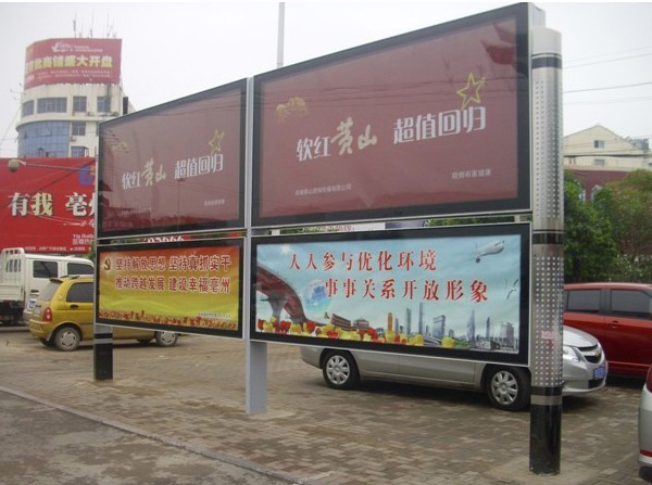 雙立柱式設計,外形美觀、大方。滾動廣告燈箱與閱報欄燈箱都是雙面的。制作材質與外框顏色可自選。